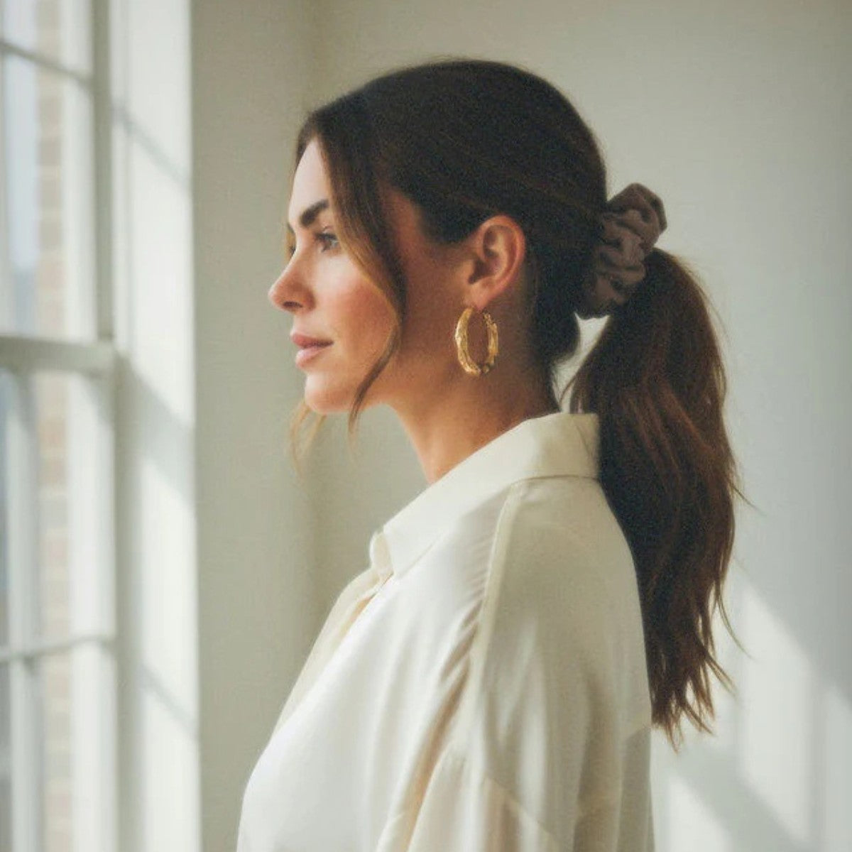 What it is: A luxuriously soft, suede, classic sized scrunchie from Chelsea King in a warm neutral tone.